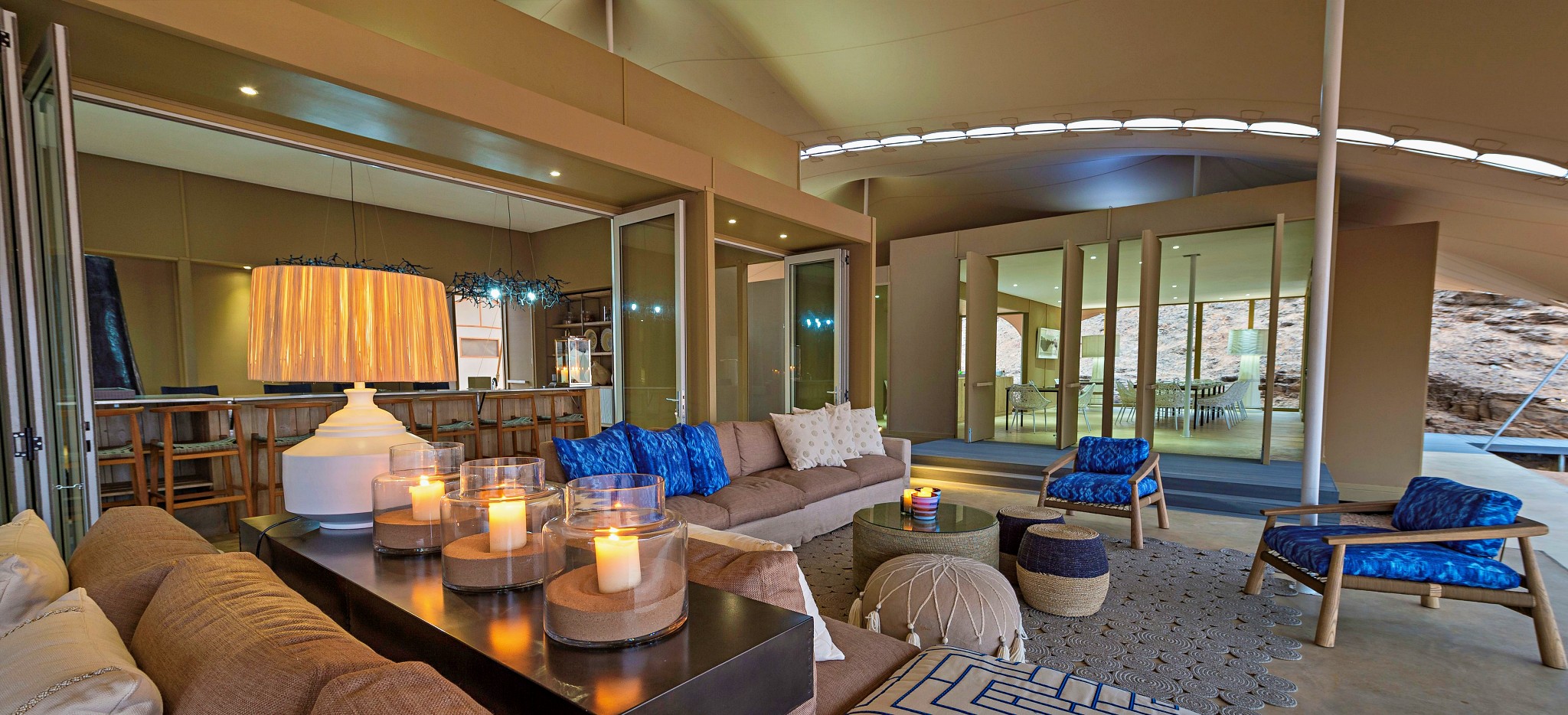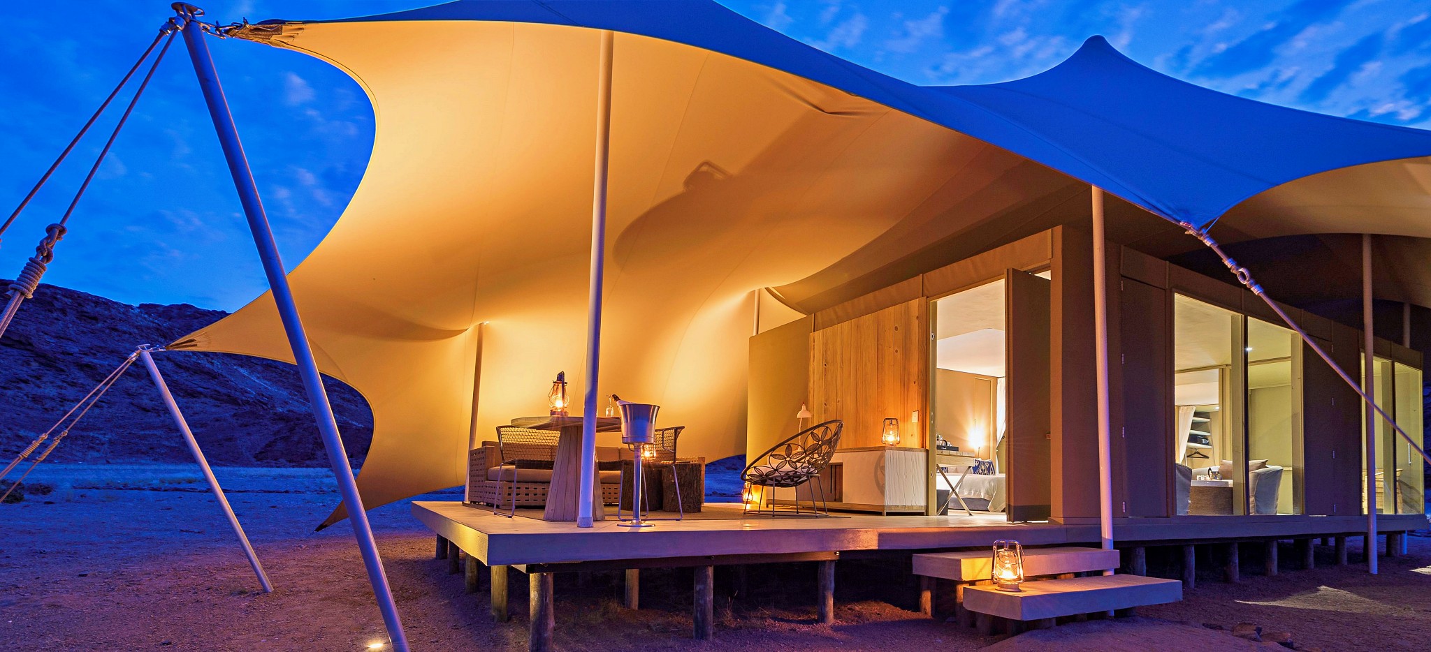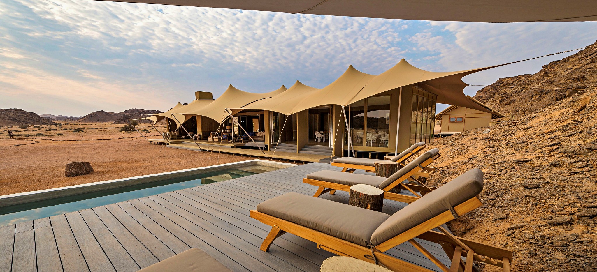 Das nur per Kleinflugzeug erreichbare Hoanib Skeleton Coast Camp bietet in einer kargen Wüstenregion hohe Exklusivität. Es wurde nahe einem gelegentlich Wasser führenden und daher grünen Flussbett inmitten der unendlich scheinenden Dünenwelt der Namib Wüste errichtet.