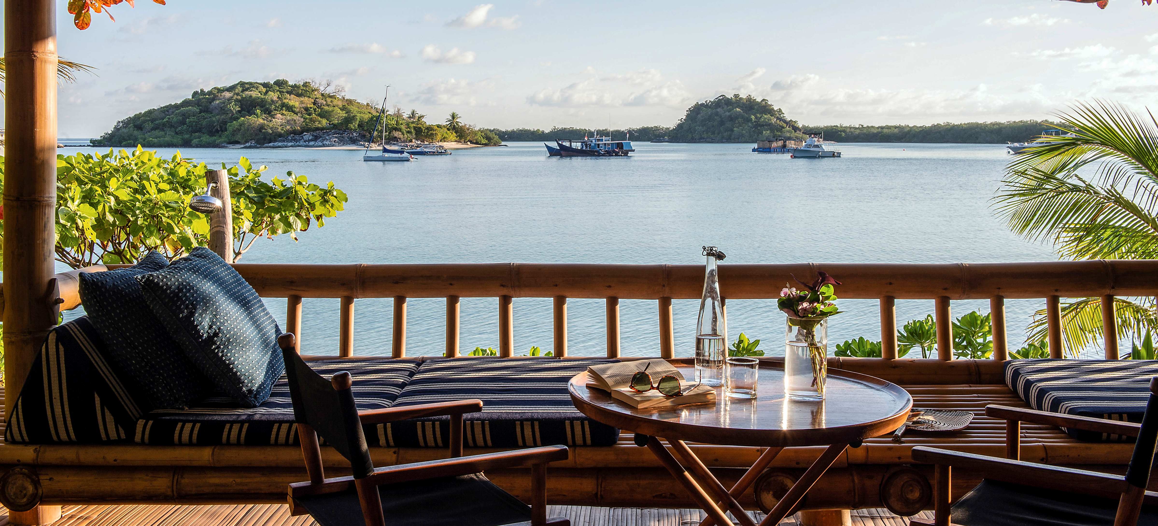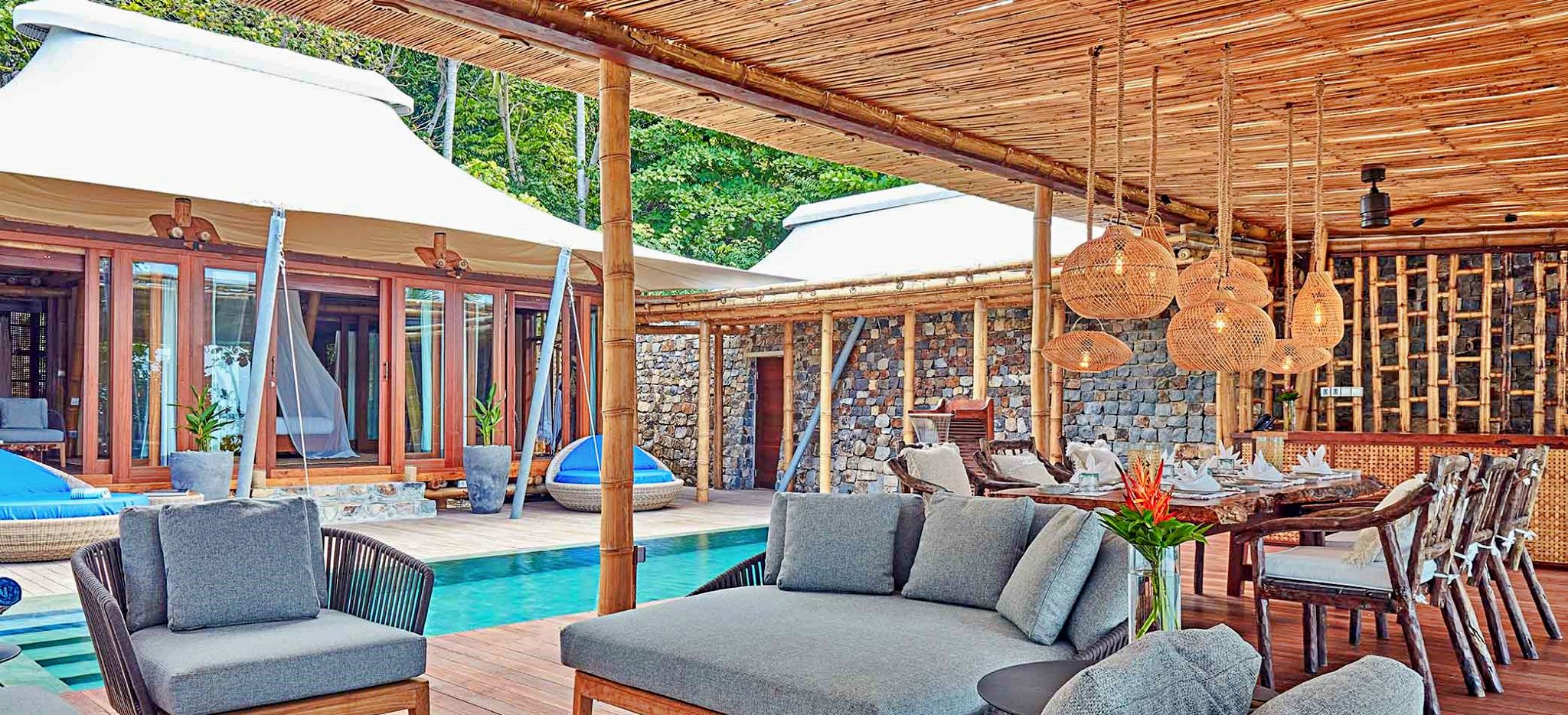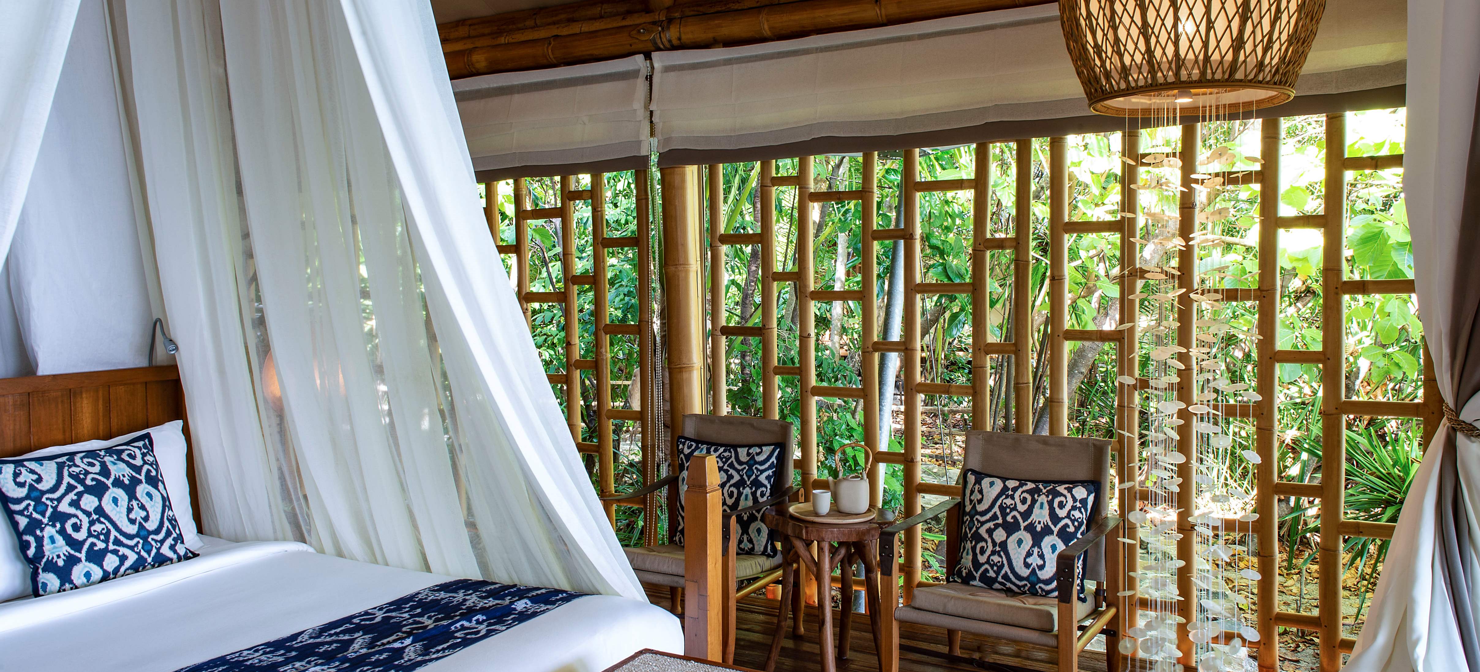 Auf der größten der sechs Bawah-Inseln befinden sich 44 einzeln stehende Luxusvillen, ökologisch rücksichtsvoll aus Bambus und lokalem Holz erbaut. Ein modernes Zeltdach über dem Naturdach schützt vor tropischen Regengüssen.