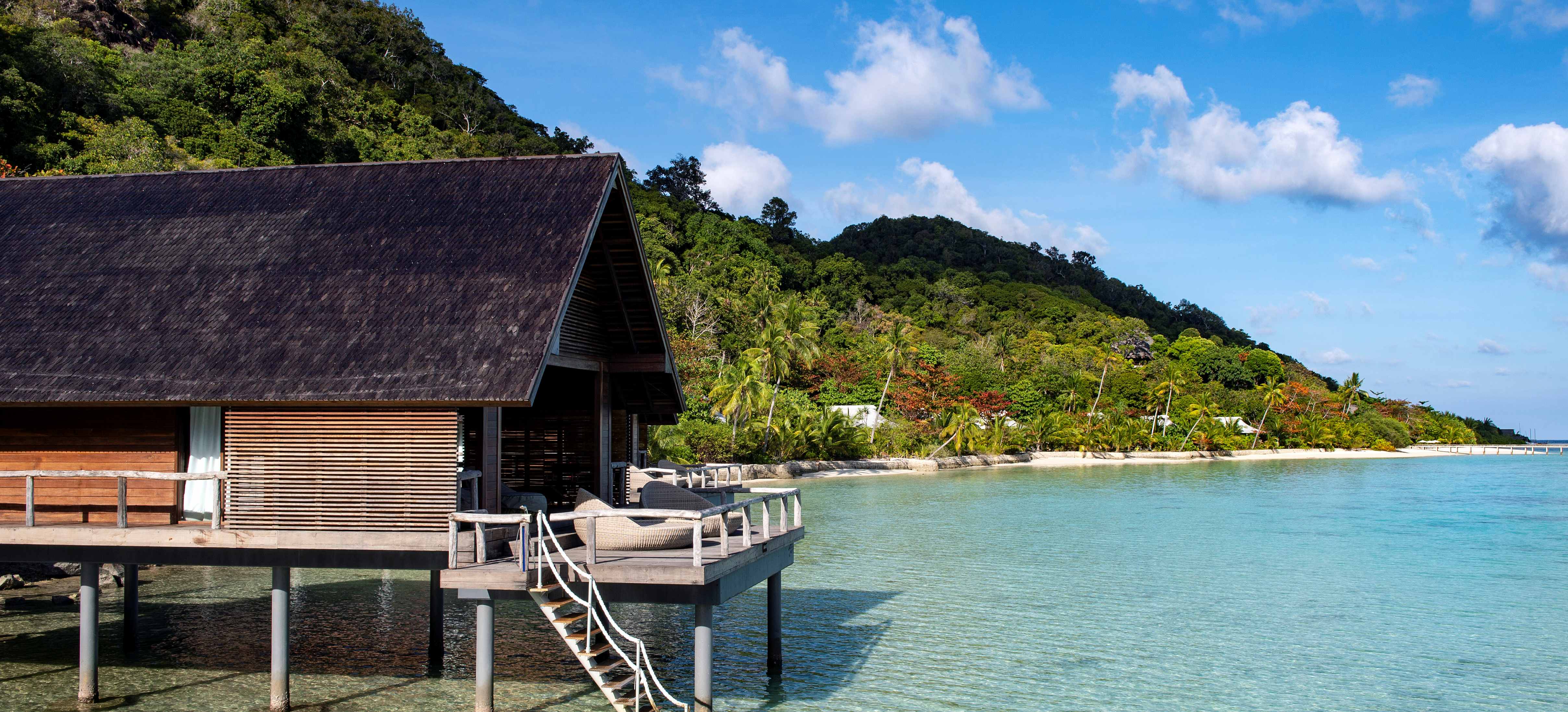 Die Overwater Bungalows stehen auf Stelzen über der Lagune. Sie sind aus heimischem Hartholz errichtet, haben 105 m² Fläche, einen Balkon, Sonnendeck und direkten Zugang in die Lagune.
