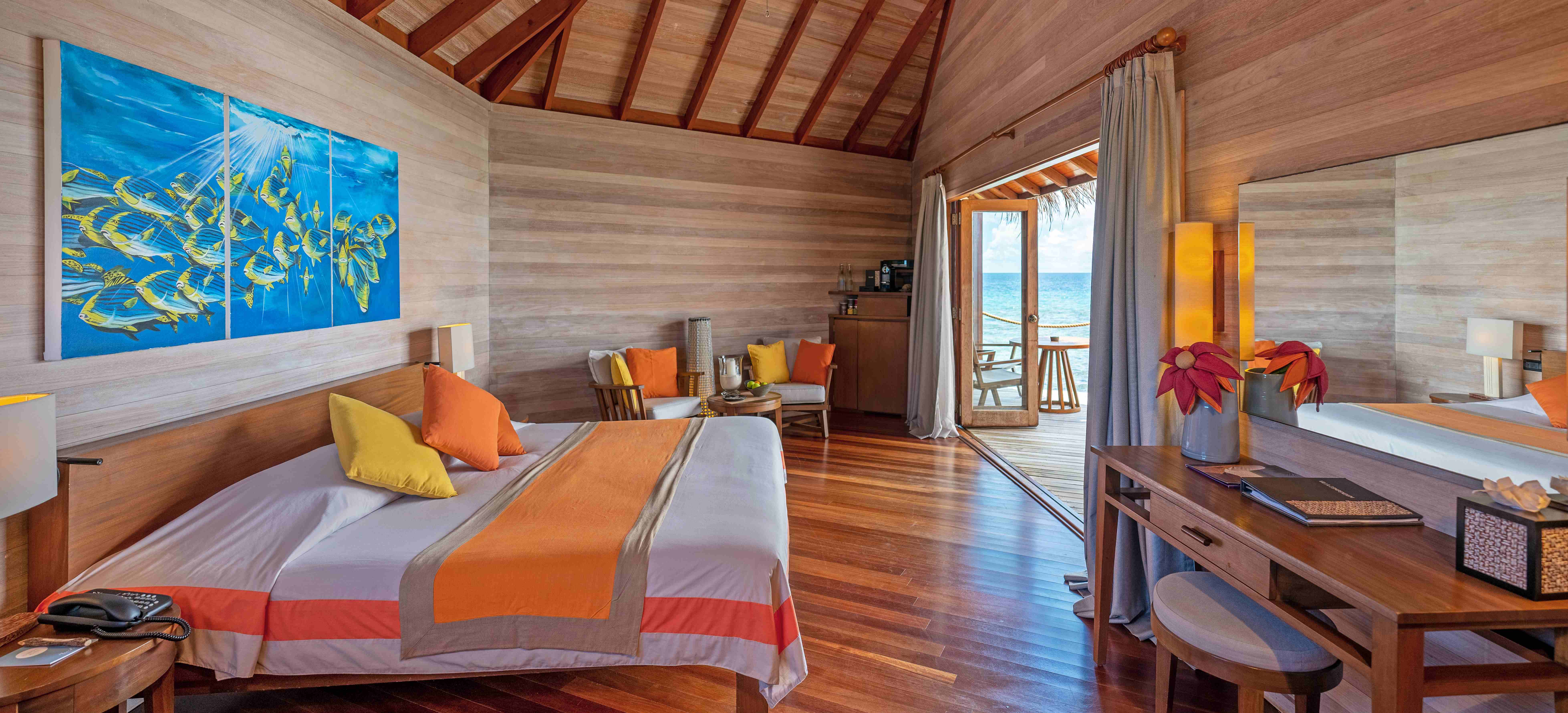 Um möglichst viel von der Fläche der Insel unbebaut zu belassen, wurden nur 6 Villen am Strand errichtet. Die übrigen Villen befinden sich auf Stelzen in der Lagune. Jede Villa hat Holzböden und ist komfortabel eingerichtet. Die Strand-Villen haben ein Open-Air-Badezimmer mit tropischer Bepflanzung.
