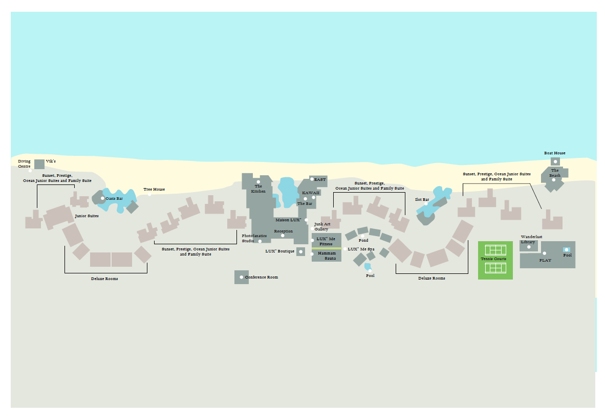 Vier Pools, ein Fitnessraum, Tennisplätze (Flutlicht) sowie Gruppenkurse in Yoga, Tai Chi und Meditation sorgen für Abwechslung. Gegen Gebühr: Fahrräder und Billard. Am Strand gibt es Windsurfer, Pedalos, Kajaks, Segelboote, Schnorcheln, Glasbodenboot-Ausfahrten und Wasserski kostenlos. Tauchen und Hochseefischen gegen Gebühr. Im Spa "LUX Me" werden Körper und Geist verwöhnt. 8 Behandlungsräume, Dampfbad, Sauna, Whirlpool, Hydro-Anwendungen. Ein Kids Club und ein Teens Club kümmern sich um Abwechslung für die Kleinen.